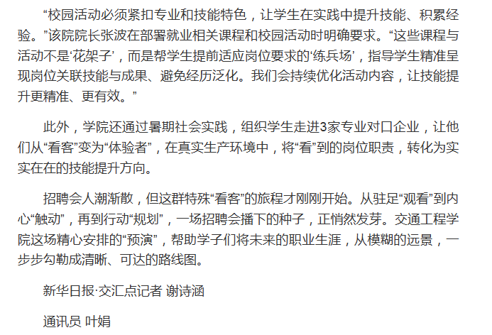 招聘会人潮渐散,但这群特殊“看客”的旅程才刚刚开始。从驻足“观看”到内心“触动”,再到行动“规划”,一场招聘会播下的种子,正悄然发芽。交通工程学院这场精心安排的“预演”,帮助学子们将未来的职业生涯,从模糊的远景,一步步勾勒成清晰、可达的路线图。