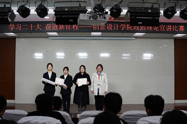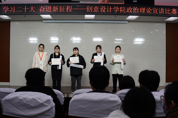 为了认真学习贯彻落实党的二十大精神,加强学生爱党爱国爱社会主义教育,激励和引领广大学生坚定不移听党话、跟党走,不忘初心、牢记使命,永葆家国情怀,3月22日下午,创意设计学院在图书馆蓝厅举行“学习党的二十大精神 携手奋进新征程”大学生政治理论宣讲比赛活动。学院党总支副书记宗怡、团委书记吴小磊、辅导员席雨辰,以及21级、22级学生代表200余人现场观摩比赛。