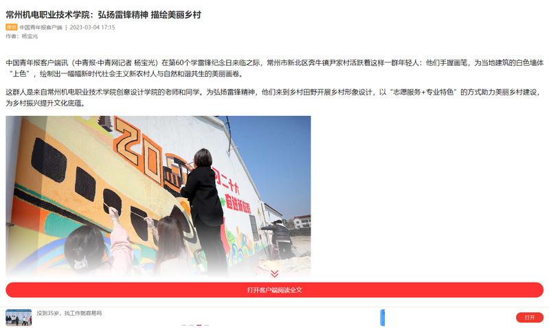 中国青年报客户端讯(中青报·中青网记者 杨宝光)在第60个学雷锋纪念日来临之际,常州市新北区奔牛镇尹家村活跃着这样一群年轻人:他们手握画笔,为当地建筑的白色墙体“上色”,绘制出一幅幅新时代社会主义新农村人与自然和谐共生的美丽画卷。