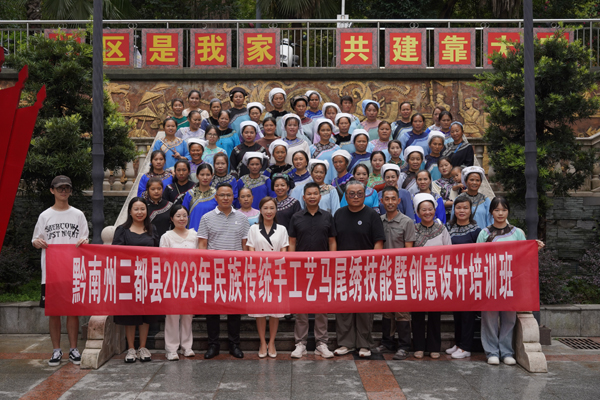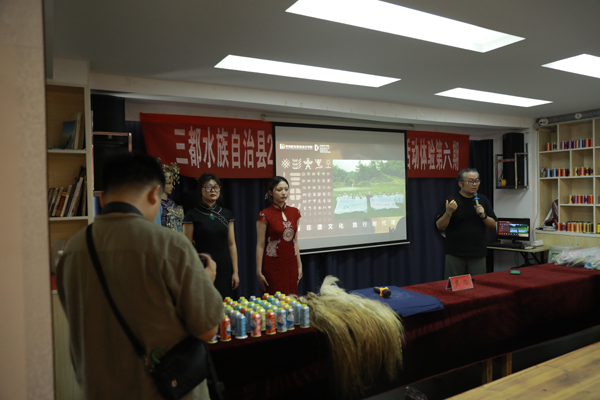 实践团队老师应邀参加了黔南州三都县2023年民族传统手工艺马尾绣技能暨创意设计培训班,团队指导老师樊旭开展了“吉水长天”主题文创设计讲座,从文创产品的主题定位、市场调研、文创开发、设计生产等角度讲解了非遗文创的设计与开发,通过大量的设计案例,多维度的介绍了“吉水长天”项目,更新了绣娘的理念与思路,打破固有观念,引领绣娘创作处更多的创新产品。