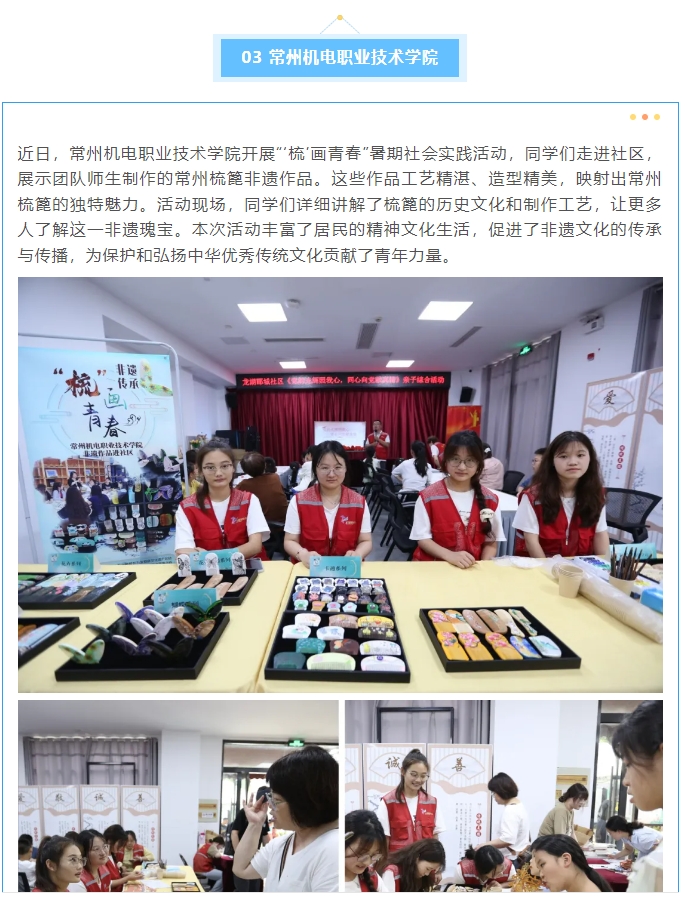 近日,常州机电职业技术学院开展“‘梳’画青春”暑期社会实践活动,同学们走进社区,展示团队师生制作的常州梳篦非遗作品。这些作品工艺精湛、造型精美,映射出常州梳篦的独特魅力。活动现场,同学们详细讲解了梳篦的历史文化和制作工艺,让更多人了解这一非遗瑰宝。本次活动丰富了居民的精神文化生活,促进了非遗文化的传承与传播,为保护和弘扬中华优秀传统文化贡献了青年力量。