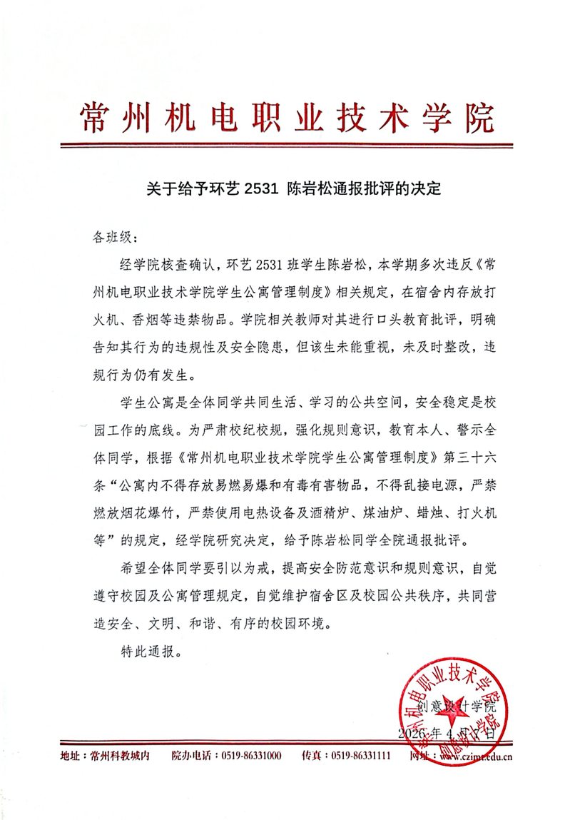 关于给予环艺2531陈岩松通报批评的决定