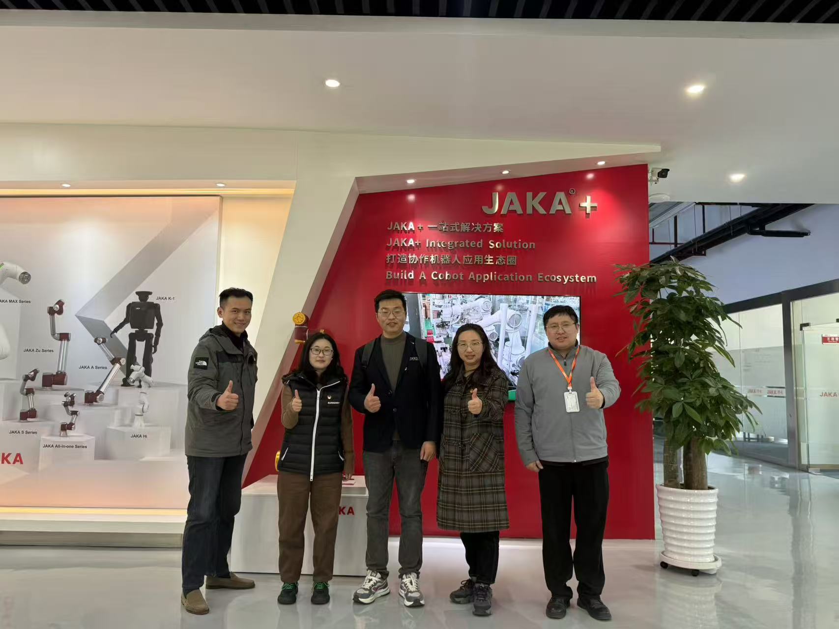 抵达公司后,在节卡机器人教育 BU 的吴家佳和李文良的热情带领下,学院调研团队首先参观了节卡协作机器人工厂。自动化的生产线、智能化的操作流程以及机器人与工人协同作业的场景,都给调研团队留下了深刻的印象。通过现场参观,学院教师们直观了解到节卡协作机器人在实际生产中的应用情况,感受到了行业前沿的技术水平和发展趋势,这为学院在智能机器人专业的教学实践中提供了宝贵的现实案例和参考依据。