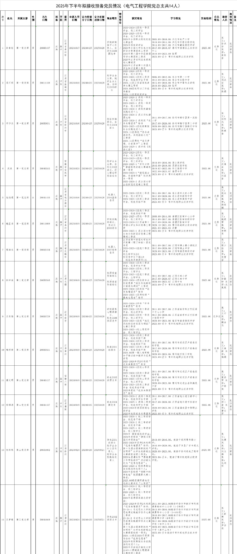 经各支部推荐,学校党委预审并结合学业、工作等综合表现,拟发展徐春钰等14名同志为中共预备党员,现将名单公示如下,公示时间:2025年9月3日-9月9日,有情况可在公示期内向电气工程学院党总支反映。