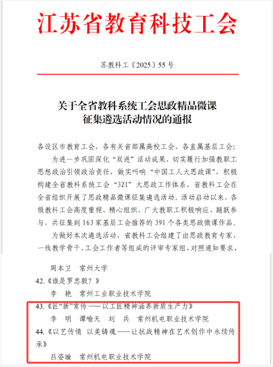 近日,江苏省教育科技工会公布了2025年全省教科系统工会思政精品微课遴选结果。我校马克思主义学院李明、谭喻天、刘兵三位教师的《匠“新”常传——以工匠精神涵养新质生产力》与创意设计学院吕姿璇老师的《国之征程 青年挺膺》两门课程成功入选。