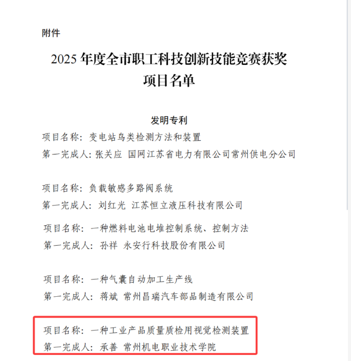 近日,常州市总工会联合市科技局、工信局等五部门共同举办的2025年度全市职工科技创新技能竞赛获奖名单公布。我校推选的《一种工业产品质量质检用视觉检测装置》获评“发明专利”专项奖。