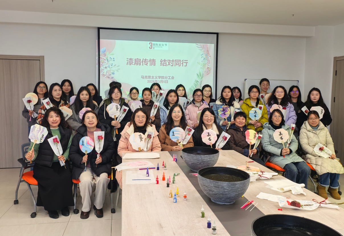 为庆祝“三八” 国际劳动妇女节,丰富女教职工精神文化生活,营造温馨和谐的校园氛围,2026 年 3 月 5 日下午,马克思主义学院分工会在图文信息楼 1012 室举办 “漆扇传情・结对同行” 三八节主题活动。学院分工会主席朱尤蔓主持活动,全体女教职工参加。