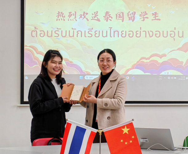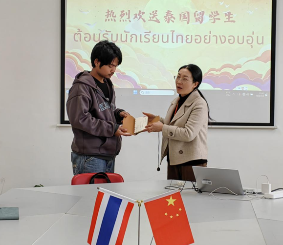 高淑红致辞,祝贺留学生们顺利完成培训任务,并勉励他们回到泰国继续学习中文,欢迎他们再次来中国攻读更高学位,继续深造。她将亲手书写了离别寄语的笔记本颁发给每一位泰国学生。同学们十分感动,表达了对学校对中国的依依不舍。