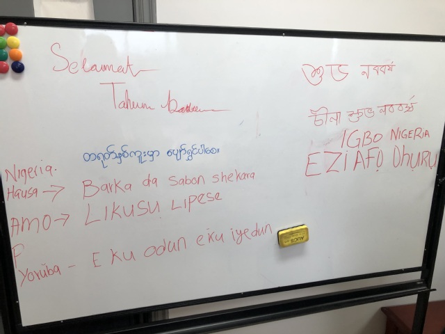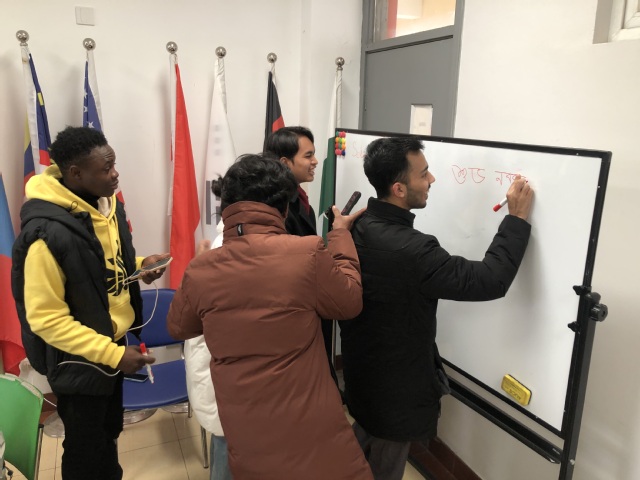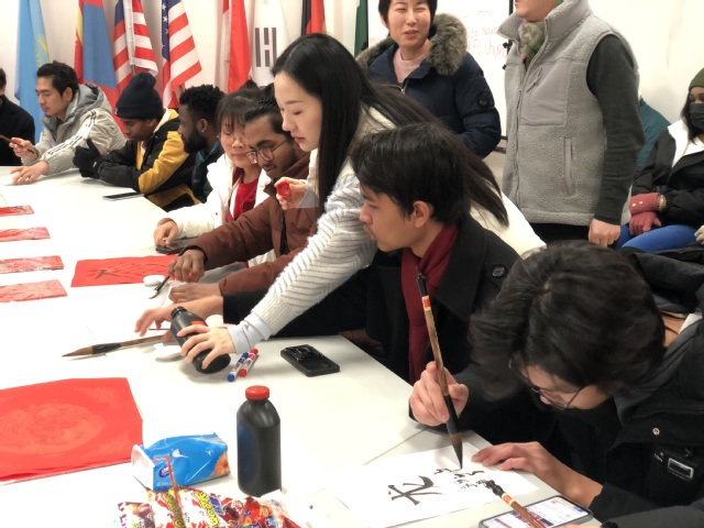 在场师生,在红纸上挥毫泼墨,认真书写寓意福气和好运的福字,让留学生们深刻体会到了中国传统的吉祥文化。同时,留学生们纷纷用彩笔在留言板上写下他们对新一年的美好期许,用自己的母语表达了对中国新年的祝福。这些祝福语汇聚了世界许多地方的语言特色,成为了一场跨越山海的祝福盛宴。