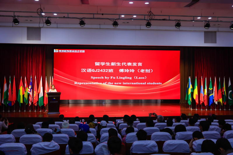 许朝山为2024及新生代表颁发常州机电职业技术学院学生证。留学生新生班主任代表宗晓倩老师、老挝籍新生代表傅玲玲在开学典礼上发言。