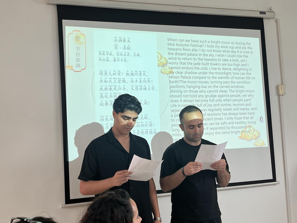 活动以生动的双语解说拉开帷幕。中外师生围坐一堂,循着嫦娥奔月的浪漫传说、吴刚伐桂的经典故事,共同探寻“月圆人团圆”背后承载的家国情怀与文化密码。随后,两位留学生代表声情并茂地朗诵《水调歌头》。尽管汉语发音尚带着些许青涩,但字里行间的真挚情感,将思乡情愫与中秋意境传递到每一位听众心中,现场掌声此起彼伏,中外文化的共鸣在诗词声中悄然升温。