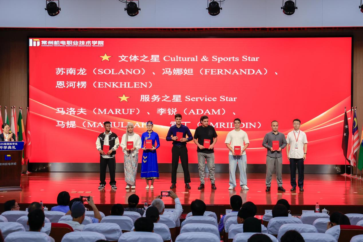 副校长黄宝玲为2025级新生代表颁发常州机电职业技术学院学生证。国际学生班主任代表方闽江老师、土耳其籍新生代表擎宇在开学典礼上发言,表达了对新学期的期待与憧憬。