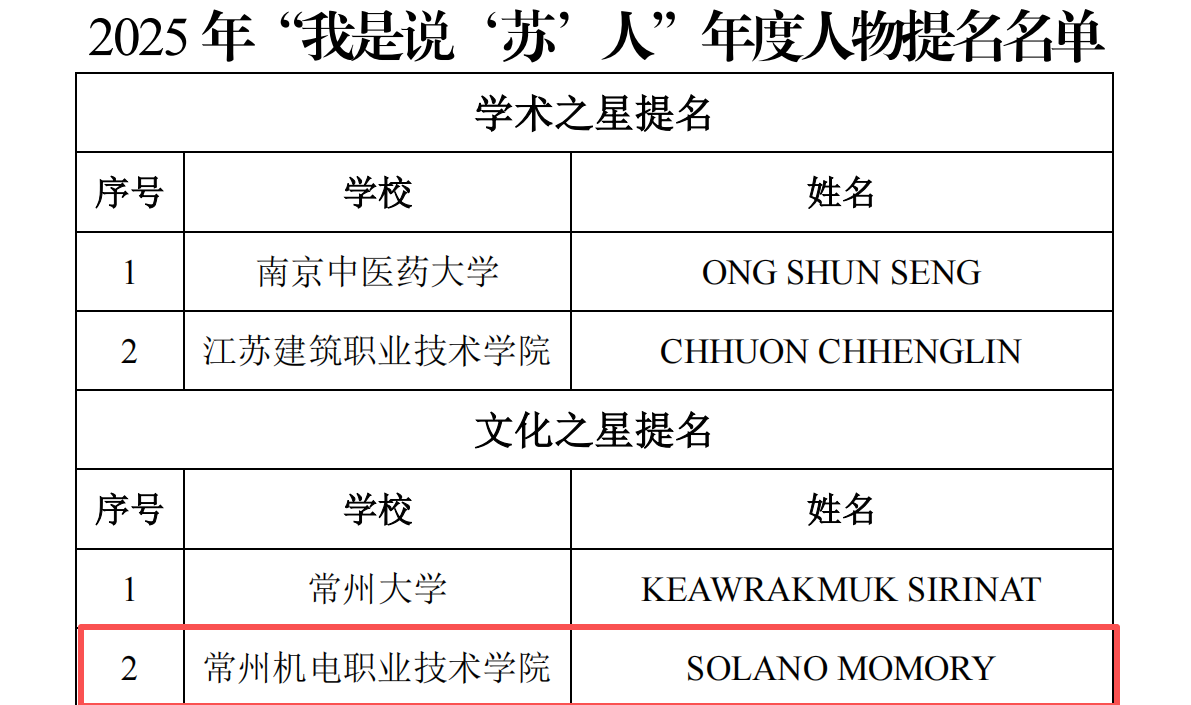 近日,2025年度“我是说‘苏’人”年度人物评选结果公布。经江苏省教育厅指导、江苏省高等教育学会外国留学生教育管理研究委员会组织评审,我校几内亚籍留学生SOLANO MOMORY(中文名:苏南龙)荣获“文化之星”提名。