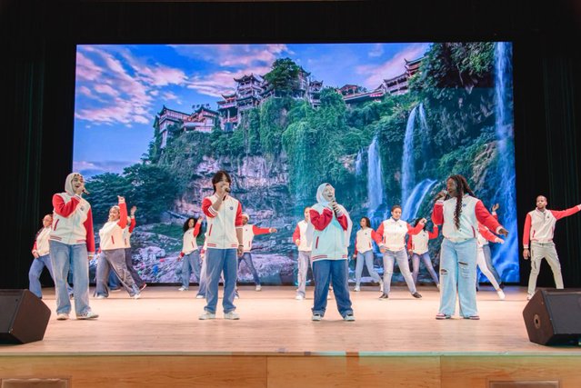 此外,我校留学生带来的歌舞表演《相亲相爱》更是现场一大亮点,他们身着统一服装,以饱满的热情、整齐的动作演绎曲目,欢快的旋律与温暖的氛围感染全场,尽显中外学子的深厚情谊。
