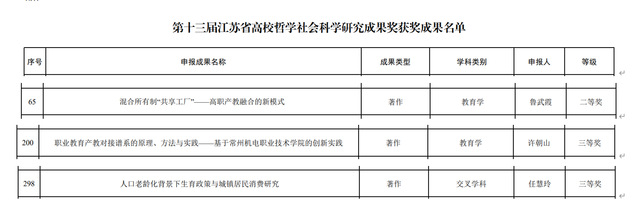 4月23日,江苏省教育厅印发《省教育厅关于公布第十三届江苏省高校哲学社会科学研究成果奖获奖成果的通知》(苏教社政函〔2024〕8号),学校获二、三等奖共三项。其中,高职教育研究院专职研究员鲁武霞的论著《混合所有制“共享工厂”——高职产教融合的新模式》获二等奖。