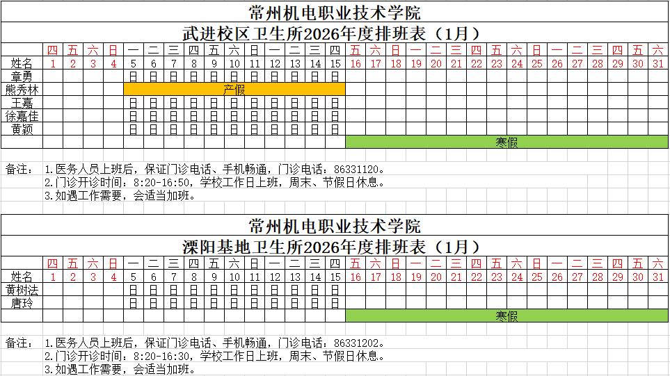 2026年1月份武进校区、溧阳基地卫生所值班表