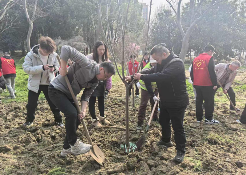 活动现场,参与活动的师生们分工协作、挥锹铲土、挖坑扶苗、填土压实、提水浇灌,每一道工序都有条不紊、认真细致。党员同志们充分发挥先锋模范作用,带头扛起劳动重任,手把手向青年学生传授植树技巧,讲解树木养护知识。青年学生们干劲十足、活力满满,积极投身植树劳作,在实践中感受劳动的乐趣,领悟生态文明的深刻内涵。大家以汗水浇灌新苗,以协作传递绿色理念,一株株树苗在校园里扎根挺立,为春日的校园勾勒出盎然生机,也搭建起党团联动、师生同心的绿色桥梁。
