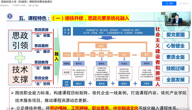 本次备课会以“深化课程教材思政建设,培育制造强国技术人才”为主题,包括专家领学、说课展示、点评研讨三大环节,旨在通过政策解读、经验分享、说课展示和专家点评,推动装备制造类课程思政与教材一体化建设。