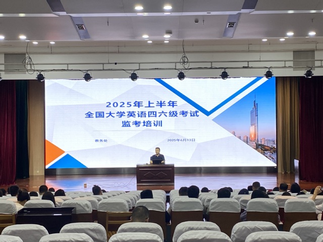 2025年6月13日下午,我校在武进校区红厅隆重召开全国大学生英语四、六级暨专业英语四级考试监考工作培训会。教务处负责人、考务及教务处相关人员及全体监考教师共计325人参会。会议由教务处处长吴荣主持。