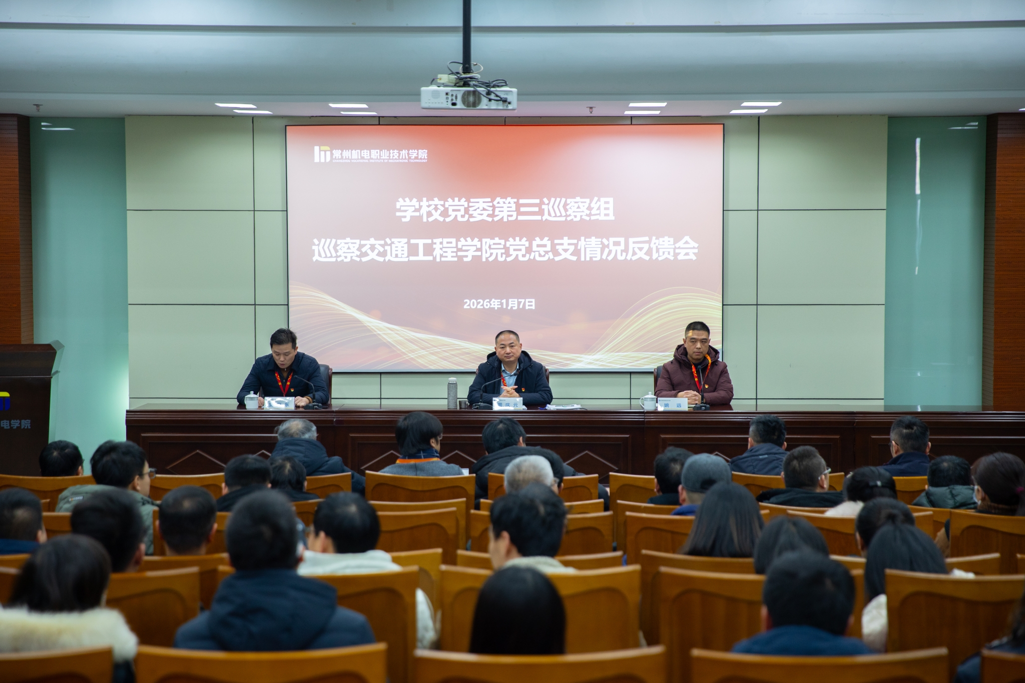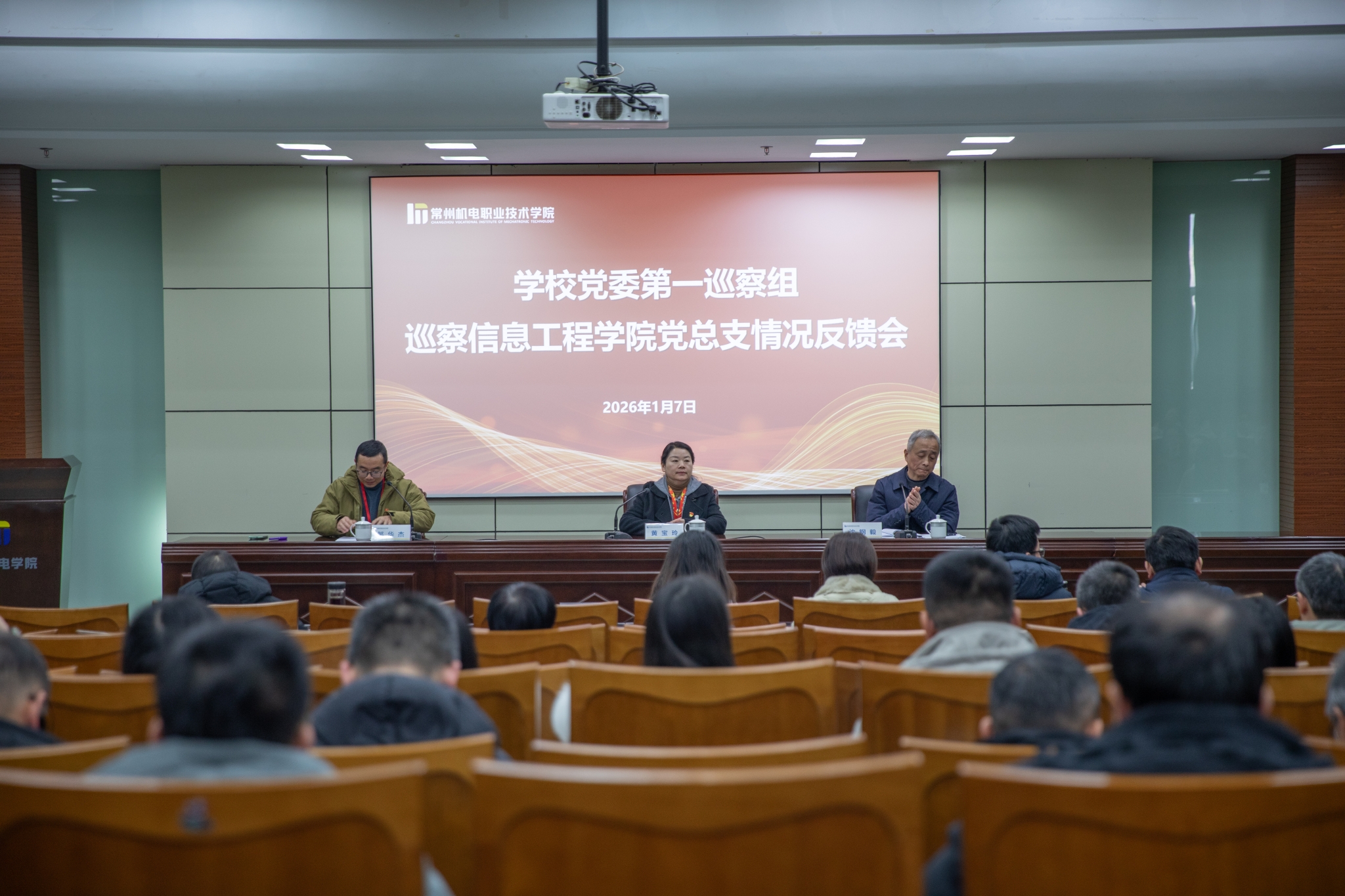 1月7日下午,学校党委2025年常规巡察反馈会在紫厅召开。党委巡察组分别向信息工程学院党总支、经济管理学院党总支、交通工程学院党总支现场反馈巡察情况。校党委委员、副校长、党委第一巡察组组长黄宝玲,校党委委员、纪委书记、党委第二巡察组组长丁振中,校党委委员、副校长、党委第三巡察组组长周庆元分别出席会议并宣读反馈意见,巡察组全体成员、被巡察党总支全体教职工参加,被巡察党总支书记主持会议。