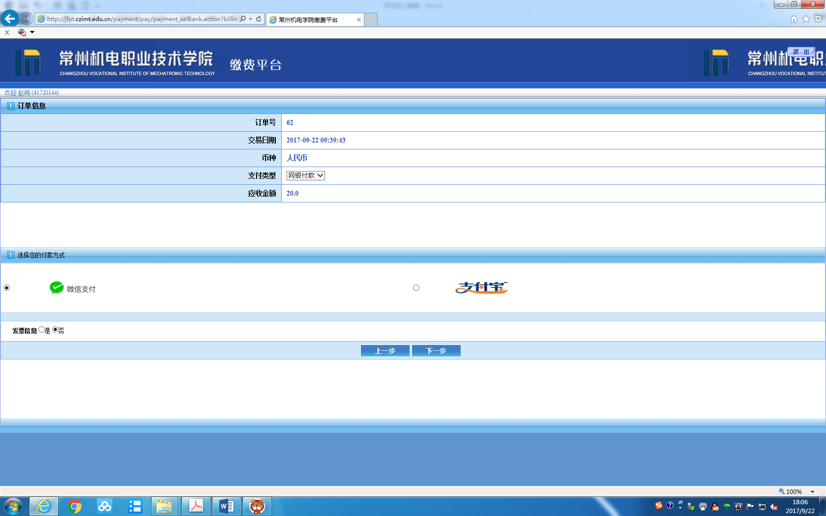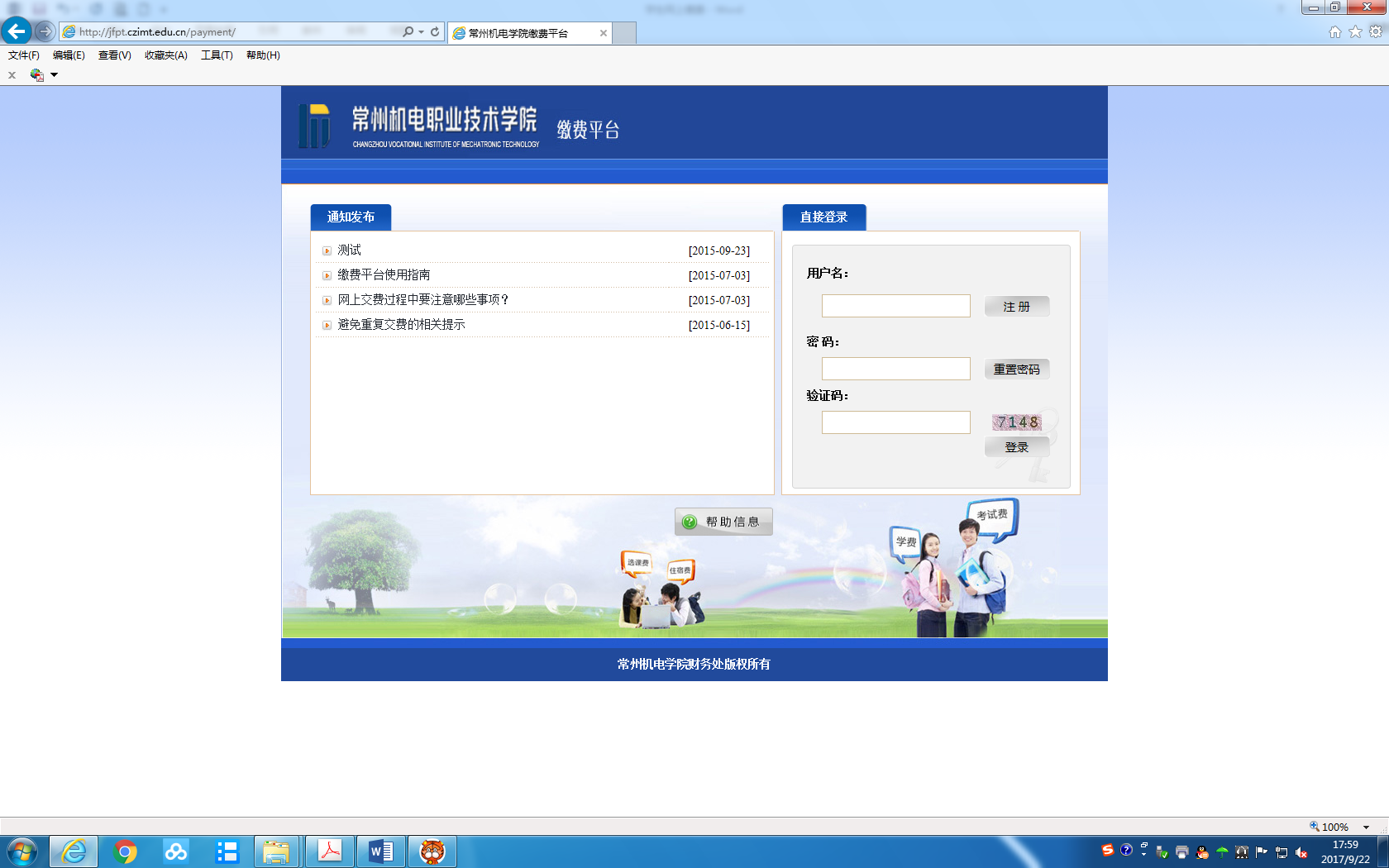 常州机电职业技术学院成人高等教育2026级新生报到须知 发布时间:2026-01-15 文章来源:继续教育 2026级新生:您好!欢迎来到常州机电职业技术学院学习!为顺利完成注册及入学手续,请您仔细阅读以下内容: 一、网上缴费 学校实行缴费报到制,在学校官方平台完成缴费后,视为报到成功。 (一)缴费时间 截止日期:2026年2月28日(逾期未缴费视为自动放弃入学资格,请务必在截止日前完成缴费)。 (二)缴费方式(电脑端和手机端,两种方式) 1.访问网址:http://jfpt.czimt.edu.cn; 2.学校微信公众号“常州机电职业技术学院财务处” 进入缴费平台; 3.登录信息:登录账号为本人学号(见《录取通知书》左下角13位数字,即为学号),初始密码为“jd@身份证后6位”; 4.操作说明:详见《新生学费缴纳流程》。 特别提示:1.商户名称或收款方一定是常州机电职业技术学院。 2.请勿同时在电脑端和手机端操作,以免发生重复缴费。 二、报到时间(录取通知书领取时间) 具体报到时间由各教学点另行通知,请新生密切关注所属教学点的通知信息,按时完成报到手续。 三、联系咨询 如需咨询相关问题,可拨打校本部或校外教学点电话咨询。 1.校本部:0519-86331065(1月19日-23日,上午9:00-11:00,下午14:00-16:00); 2.校外教学点联系方式可通过江苏省高等学历继续教育阳光平台进行查询(网址https://ygpt.jsou.edu.cn/Index)。 (注:2026年1月16日-2026年2月27日学校放寒假,值班安排以外时间如有报到问题咨询或在缴费过程中遇到提示信息错误等原因无法完成缴费的,请在2月28日开学后电话联系校本部:0519-86331065。) 四、其他事项 1.校本部地址:江苏省常州市鸣新中路26号继续教育学院(图书馆817); 2.费用说明:学校财务系统只收取学费不含教材费。 常州机电职业技术学院继续教育学院 2026年1月 附:新生学费缴纳流程 简要说明 1.网上缴费的时间:网上缴费系统开放期间均可(22:00-24:00不能缴费)。 2.登录缴费系统方法:您可以采用以下两种方式 直接访问网址:http://jfpt.czimt.edu.cn;或访问学校微信公众号“常州机电职业技术学院财务处” 进入缴费平台。 3.打开缴费平台首页后,输入您的用户名、密码和附加码后单击“登录”,用户名为学号,初始密码为jd@身份证最后六位(或者为身份证最后六位)。 4.登录进入系统后,系统将显示一张应缴费清单,请通过单击费用名称前的复选框来选中缴费项目。如果某一收费项本次不是完全缴清,可在“本次支付”窗口输入本次要缴费的金额。确认无误后单击“支付”按钮。 5.选择本次缴费项后,需要对缴费订单进行确认,订单确认后将不能修改。 6.选择支付途径后,系统将引导您到相应的网上支付平台进行支付 。 7.系统出现“银行扣款成功”的页面后,说明缴费操作基本完成。一般情况下5分钟之内可以看到相关费用项的已缴纳情况。 8.点击“缴费历史查询”可以查询到相关缴费信息,在应缴费清单下会列出您所生成的订单信息及其费用项情况。 具体操作指南: 网上缴费提供电脑端和手机微信公众号缴费两种方式,用户名为学号,初始密码为jd@身份证最后六位(或者为身份证最后六位)。 特别提示:1.商户名称或收款方一定是常州机电职业技术学院。 2.请勿同时在电脑端和手机端操作,以免发生重复缴费。 一、电脑端缴费操作说明 第一步,浏览器输入网址http://jfpt.czimt.edu.cn进入缴费平台,输入用户名、密码和附加码后单击“登录”。