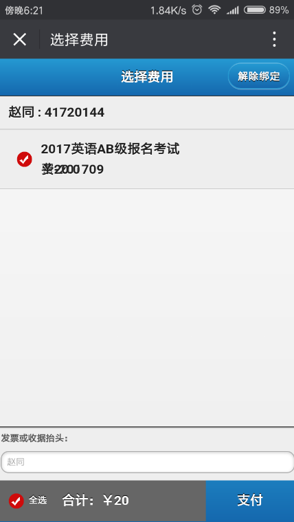 第三步,输入用户名和密码,进入如下缴费界面,点击选择相应的缴费项,确认缴费金额无误后,点击右下角支付按钮,进入支付界面再次核对订单信息。