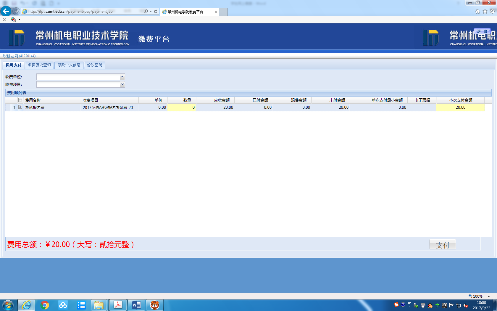 第二步,登录进入缴费平台系统后,进入如下图所示的系统使用界面。在功能菜单下的“费用项列表”中列出了相应的费用项信息。
