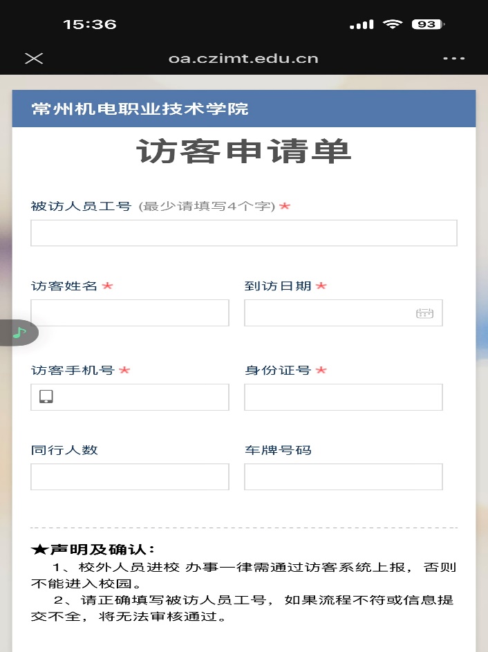 3.提醒:请提前关注“常州机电职业技术学院”微信公众号,点击左下角“机电服务”-“访客申请”-填写工号(见上表)-填写个人信息-提交入校登记,凭手机批准短信入校。