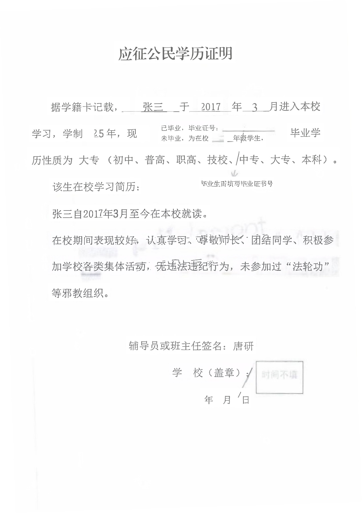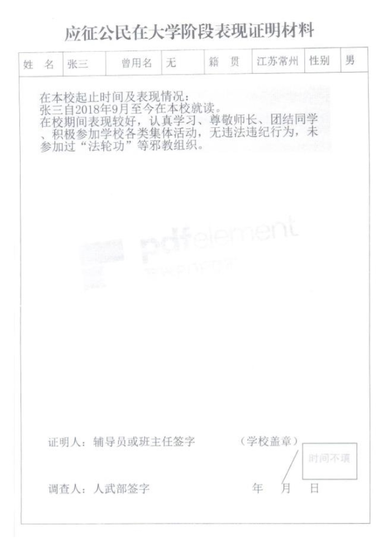 2.《大学生在校表现证明》《应征公民学历证明》等其他材料(武装部或派出所提供的固定格式)