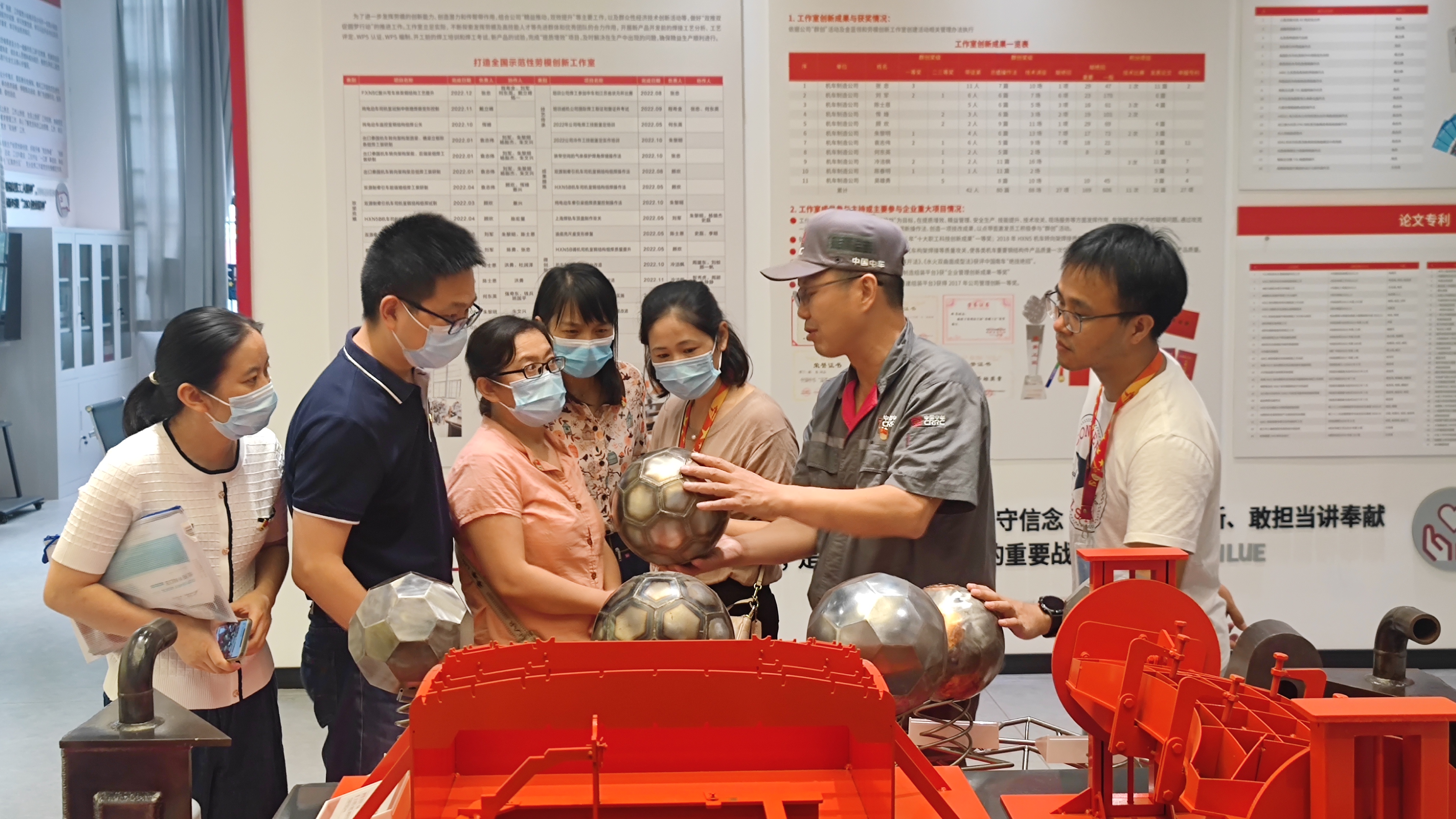 张忠劳模以及劳模工作室的技能大师们带领全体党员教师和学生参观了劳模创新工作室。工作室内陈列的各种各样的技能大赛奖杯、优秀作品承载着技能大师们对中国制造的使命、默默的坚持、不服输的韧劲和技能革新的担当。
