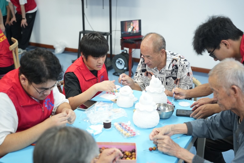 银铃实践团围绕陪伴与互动,创意开设了“七艺”代际互动小课堂,搭建起银发与青年的互动桥梁。