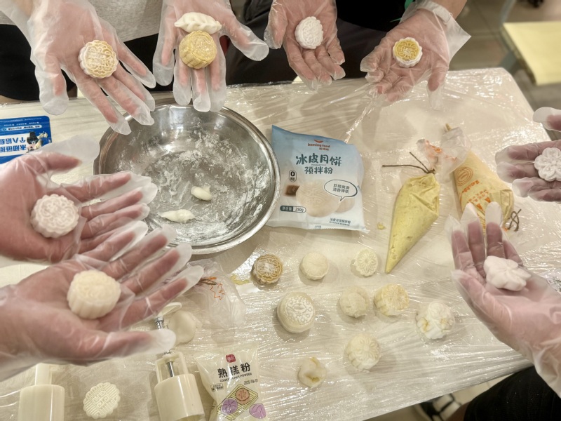 在武进校区一食堂,同学们通过AI推荐配方比例、数字化流程指引,同学们高效完成从原料称量、饼皮揉制,到包馅、压模的全过程,并在协作中感受智能科技赋能传统美食制作的便捷与乐趣。部分同学还通过AR合影技术,与自制月饼进行创意互动,展现机械学子“智造美好”的能力。
