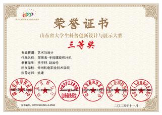 近日,第十七届山东省大学生科技节——科普创新设计与展示大赛圆满落幕。模具技术学院学生团队的设计作品《“探果者”——手摇螺旋榨汁机》凭借其巧妙的工科技术与传统美学融合的创新设计,荣获省赛三等奖。