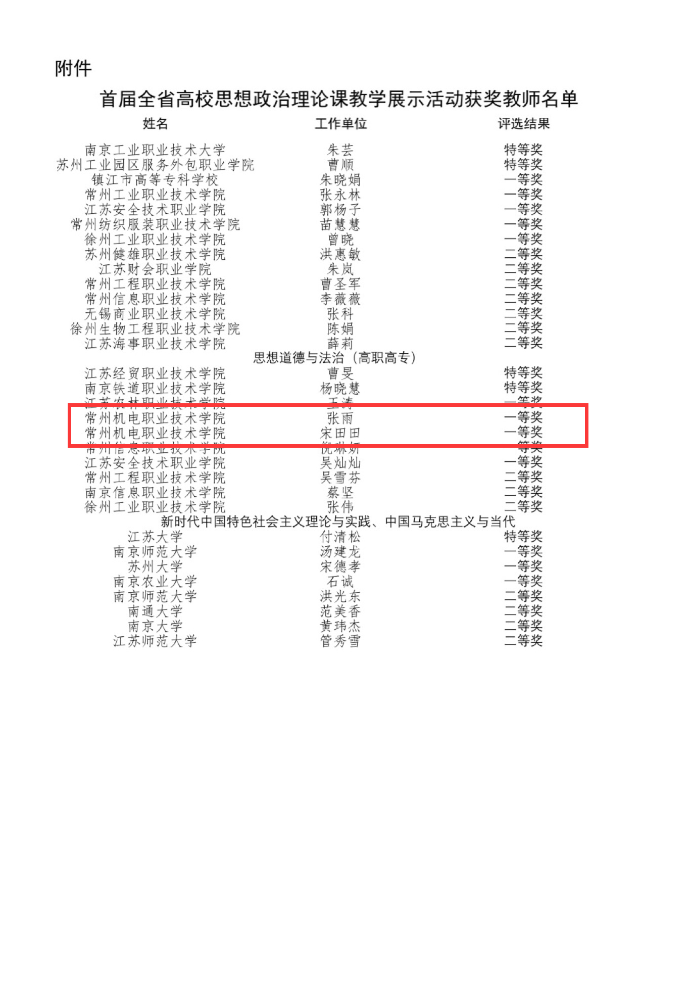 2月22日,江苏省教育厅公布了首届全省高校思想政治理论课教学展示活动评选结果,我校马克思主义学院宋田田老师、张雨老师荣获《思想道德与法治》一等奖。