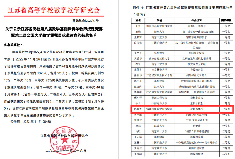 此次竞赛由江苏省高等学校数学教学研究会主办,全省高校162名数学教师参加。经过初赛,郭春香老师作为常州市唯一一名高职教师代表进入决赛与本科教师同台竞技,最终获得一等奖。