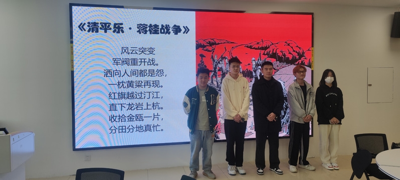 第二个阶段,同学们上台朗诵红色诗词,歌唱红色歌曲。同学们朗诵了《沁园春·长沙》《水调歌头·重上井冈山》等不同革命历史时期的经典诗词,深情回顾了中国共产党革命斗争史的光辉历程,深切缅怀了革命先辈的丰功伟绩,被诗词中展现出的坚定信仰和舍生取义、视死如归、勇于担当的精神深深感动,更加坚定了永远跟党走的理想信念。同学们敞开心扉,释放激情,唱响《保卫黄河》等红色经典歌曲。一首首红色歌曲是中国革命历史的真实写照,饱含了革命理想,体现了革命信念,抒发了革命豪情,带领大家重温了中国共产党的光辉岁月,激发了爱党爱国之情。