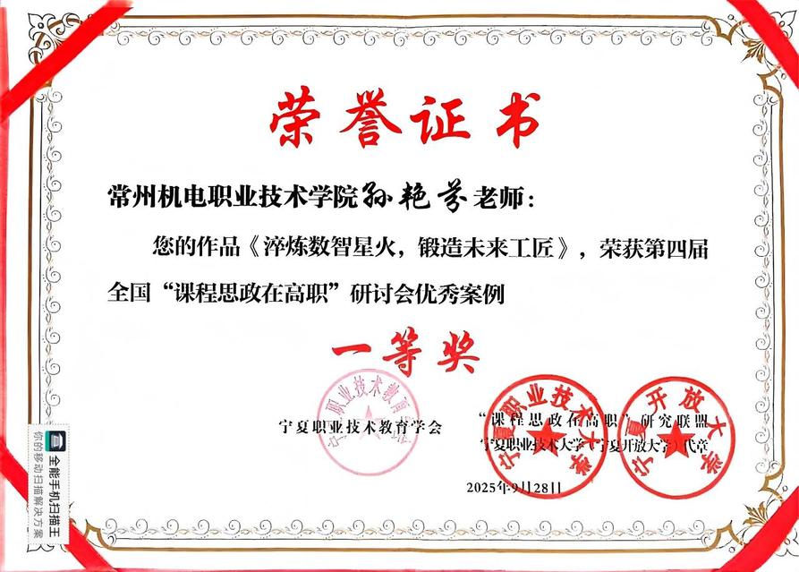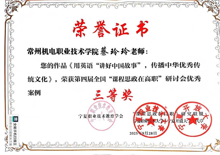 大会还表彰了2025年度高职课程思政优秀案例,我校孙艳芬老师的《淬炼数智星火,锻造未来工匠》荣获一等奖、蔡玲玲老师的《用英语“讲好中国故事”,传播中华优秀传统文化》荣获三等奖。
