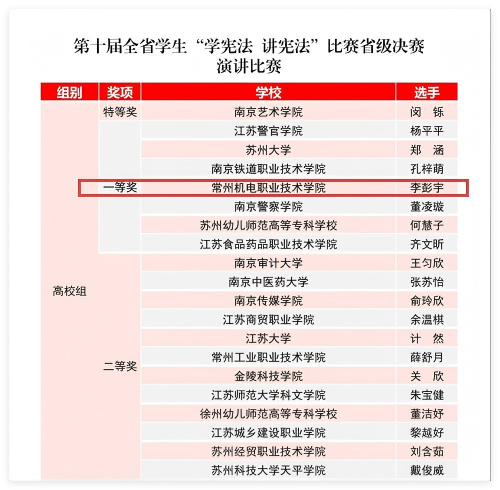 备赛期间,薛梦霞老师指导李彭宇梳理宪法条文要点,更着重引导其挖掘宪法背后的精神内涵,帮助他理解宪法如何既为国家发展划定方向,又为青年成长提供保障。李彭宇同学也始终以高标准严格要求自己,反复打磨演讲稿中宪法精神与现实案例的结合点,多次模拟比赛场景训练表达节奏,最终在决赛舞台上充分展现了常机电学子尊法学法、笃信笃行的良好精神风貌。