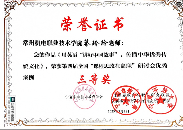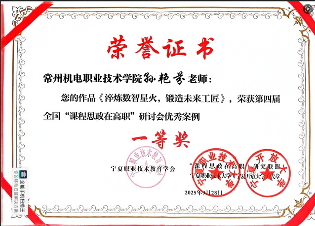 9月28日,第四届全国“课程思政在高职”研讨会暨年会在宁夏职业技术大学(宁夏开放大学)举行。本次研讨会的主题是“守正创新,融教于思,共探高职课程思政高质量发展新路径”。大会表彰了2025年度高职课程思政优秀案例,我校孙艳芬老师的《淬炼数智星火,锻造未来工匠》荣获一等奖、蔡玲玲老师的《用英语“讲好中国故事”,传播中华优秀传统文化》荣获三等奖。