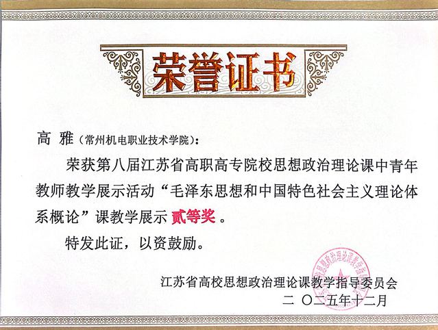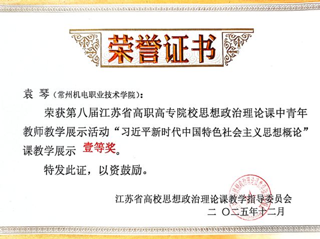 2025年12月13日—12月14日,第八届江苏省高职高专院校思想政治理论课中青年教师教学展示活动圆满落下帷幕。本次教学展示活动分为4门课程4个组别,经过初赛选拔,全省共有112名教师进入决赛。我校马克思主义学院教师袁琴获《习近平新时代中国特色社会主义思想概论》组一等奖,高雅获《毛泽东思想和中国特色社会主义理论体系概论》组二等奖。