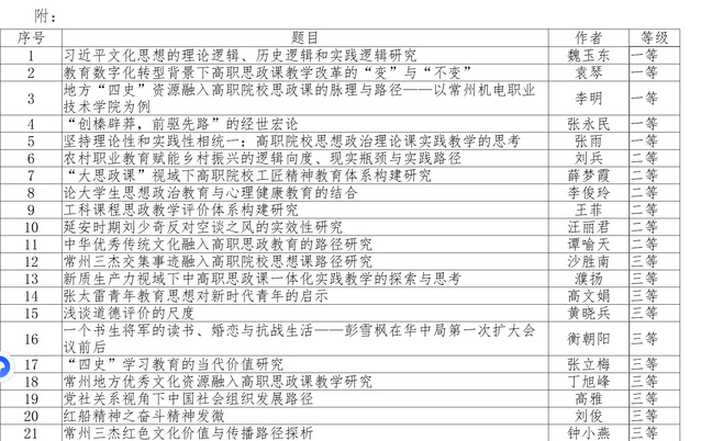 为了更好地促进学术交流、开展理论研究工作。学院在2023-2024年《太雷精神研究》和《常州历史名人理论研究》撰稿文章中(不含校刊已刊登文章),按1名署名老师推荐1篇文章的原则,经校外专家评审,优选以下21篇文章确定等级,现予以公示。希望所有老师继续赐稿,支持专刊建设,提升科研水平。