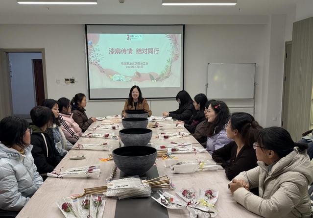 为庆祝“三八”国际劳动妇女节,丰富女教职工精神文化生活,2026年3月5日下午,马克思主义学院分工会在图文信息楼1012 室开展“漆扇传情・结对同行”主题活动。学院分工会主席朱尤蔓主持本次活动,全体女教职工参加。