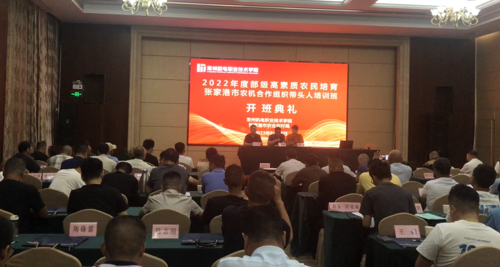 为推进高素质农民稳定、可持续发展,助力农业产业振兴,促进农民增产增收,常州机电职业技术学院承办的2022年度部级高素质农民培育--启东市、张家港市农机合作组织带头人培训于2023年8月28日正式开班,来自启东市、张家港市各乡镇120名种植、养殖大户、合作社负责人参加了本次培训。启东市农业农村局副局长王晓峰、启东市农机推广站站长徐荣、张家港市农机推广站站长邓亚坤、常州机电职业技术学院交通工程学院副院长王峰等出席了开班典礼。