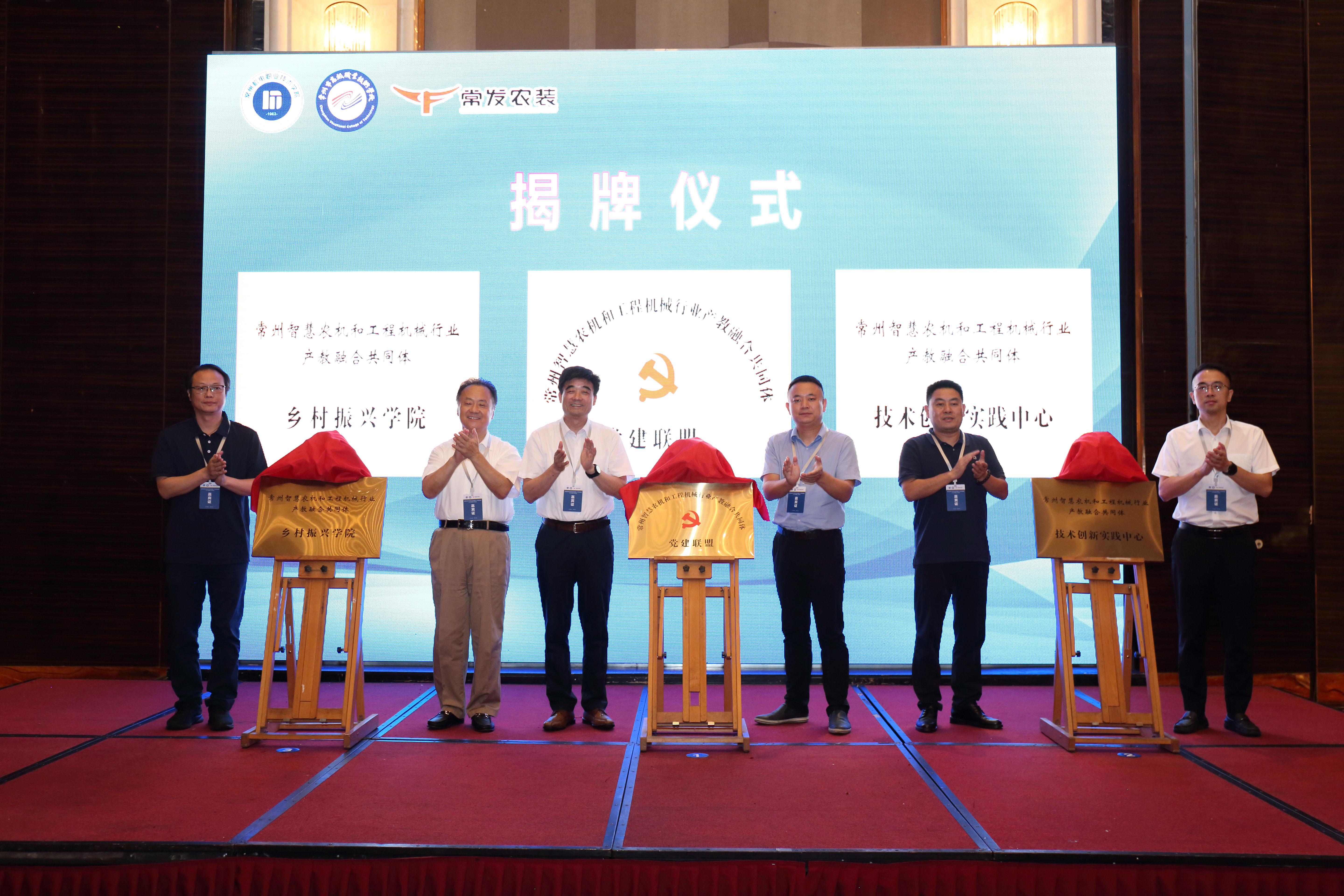 会上由常州机电职业技术学院、江苏常发实业集团有限公司、常州市高级职业技术学校作为牵头单位,联合58家知名企业、院校、科研院所共同发起的“智慧农机和工程机械行业产教融合共同体”成立。机械工业教育发展中心副主任、机械行指委秘书长郑丽梅为共同体理事长单位颁发聘书,与会领导共同为党建联盟、乡村振兴学院、创新实践中心揭牌。共同体的成立不仅标志着智慧农机、工程机械行业产教融合进入了一个全新的发展阶段,也充分展现了学校在推动产教深度融合、服务国家乡村全面振兴战略方面的坚定决心。