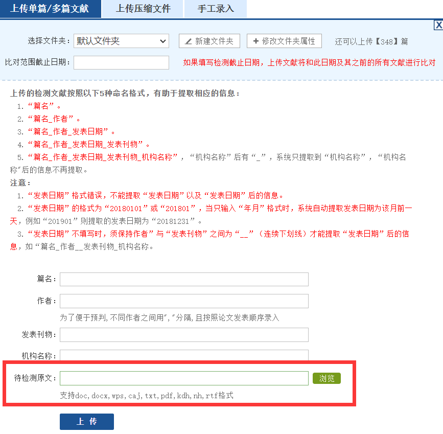 (2)支持格式:系统同时支持WPS、CAJ、PDF、KDH、NH、RTF等常见格式,但部分复杂格式可能影响文字提取的准确性。