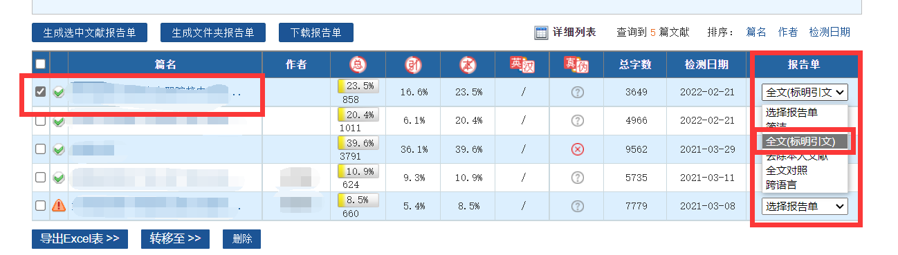 (7)比对结束,选中论文,点击“报告单”下拉菜单中的一项,打开文件。