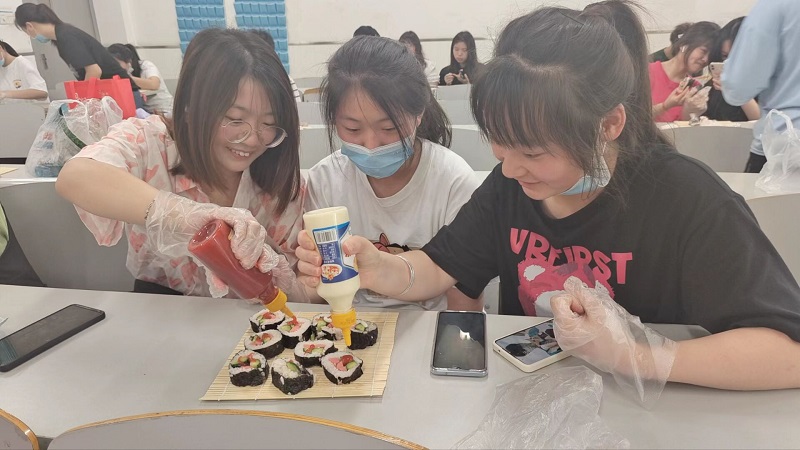 活动现场,工作人员为大家准备好用于制作寿司的竹帘、海苔、米饭、火腿、肉松、青瓜条、萝卜条、番茄酱、沙拉酱等食材,并把米饭拌上寿司醋。大家在紫菜片上摊开米饭,铺上萝卜、青瓜、火腿、撒上肉松、并抹上沙拉和番茄酱,卷一卷,再用刀切成一小块一小块装盒,亲手制作的寿司就“出炉”了。但是活动现场并没有这么顺利,“快来帮我,我的寿司裂开了”、“还以为做寿司很简单,自己动手才知道多难”、“我们的刀是不是不一样,不然咋都切不好呢”,自己动手之后才知道并不是想象的那么简单,不过最终大家都成功了。品尝着自己制作的寿司,相互交流制作工艺,享受亲自动手的快乐。整个过程轻松欢快,每个人都全身心的投入活动,最后大家带着寿司回去与朋友们一起品尝自己制作的美食。虽然活动时间不长,但意义非凡。大家忘情地投入制作、开心地品尝寿司,每个人都期待着下一次更精彩活动的开展。