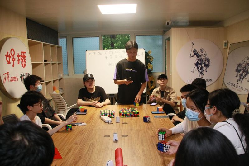 比赛现场,参赛选手热情高涨、斗志昂扬,也吸引了许多魔方爱好者的参与。随着裁判一声令下,比赛正式开始,选手十指飞快舞动,只听见“擦擦”的方块摩擦声,旁观者还没看清楚状况,一个颜色被打乱的魔方在选手的手中飞快转动,“啪”一声,魔方即被复原。在线上的活动直播间内,主持人专业的讲解更是吸了一大泼粉丝,赛场的精彩瞬间被记录了下来,活动也收到了很多同学的点赞。