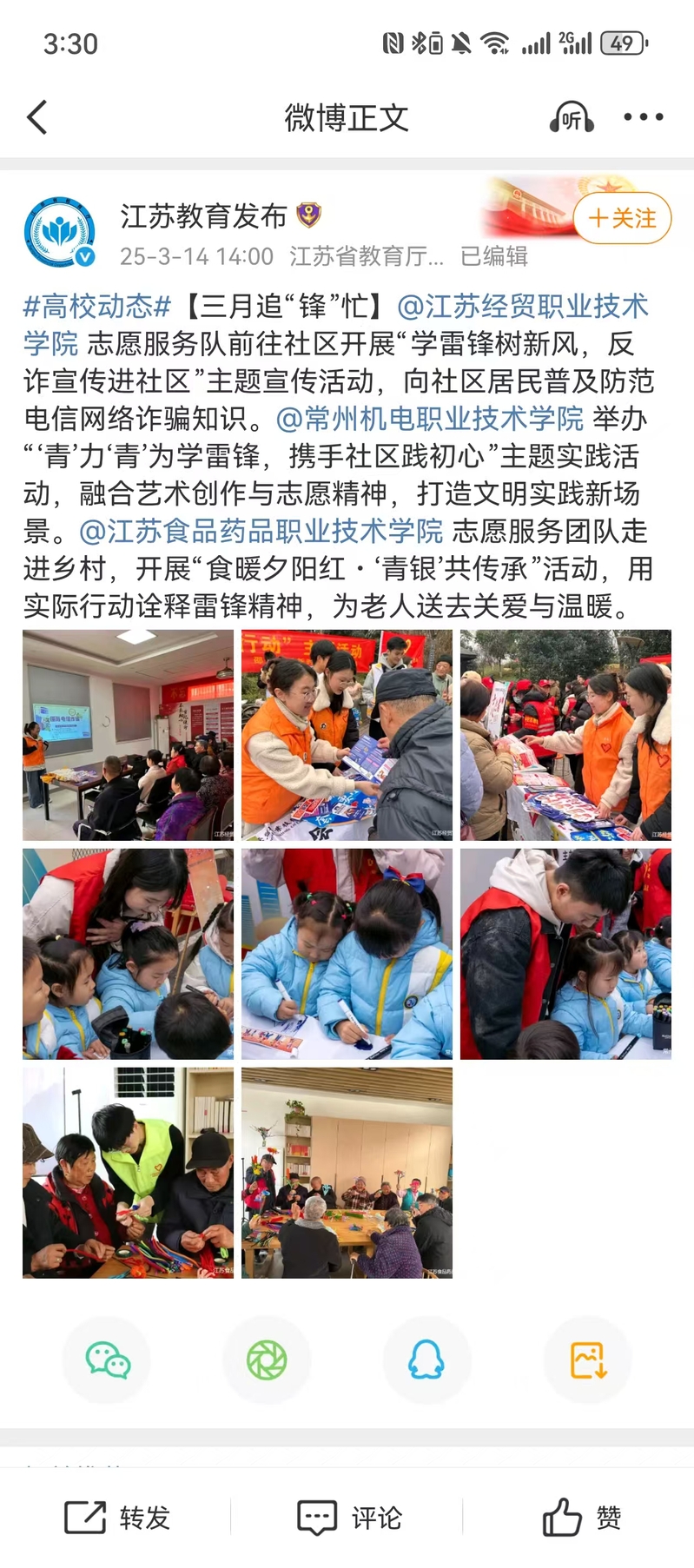 #高校动态#【三月追“锋”忙】@江苏经贸职业技术学院 志愿服务队前往社区开展“学雷锋树新风,反诈宣传进社区”主题宣传活动,向社区居民普及防范电信网络诈骗知识。@常州机电职业技术学院 举办“‘青’力‘青’为学雷锋,携手社区践初心”主题实践活动,融合艺术创作与志愿精神,打造文明实践新场景。@江苏食品药品职业技术学院 志愿服务团队走进乡村,开展“食暖夕阳红・‘青银’共传承”活动,用实际行动诠释雷锋精神,为老人送去关爱与温暖。