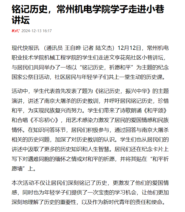 现代快报讯 12月12日,常州机电职业技术学院机械工程学院的学生们走进文亨花苑社区小巷讲坛,与居民们共同举办了一场以“铭记历史,祈愿和平”为主题的纪念国家公祭日活动,社区居民与年轻学子们共上一堂生动的历史课。